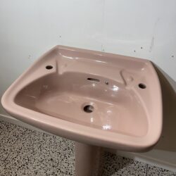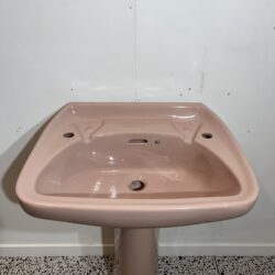 Basin and pedestal with 2 tap holes in Heather Pink made by Allia Bathrooms. Heather is a subtle, dark pink colour, produced in the 1980s by Allia Bathrooms and Stelrad Doulton. This basin which is stamped with the Allia logo is from the Ashton range, originally produced by Royal Doulton. Allia Bathrooms purchased Royal Doulton’s sanitaryware side of the company in 1983 and carried on producing Royal Doulton products except now with the Allia logo. The Ashton sink is a practical and easy to clean basin made from quality Vitreous China.