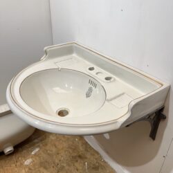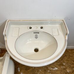 Large antique basin made by Doulton & Co sanitary engineers. This basin has a very rare gold leaf rim around the edges of it and has 2 tap holes suitable for vintage or modern taps. The basin is wall mounted and sits on two primed cast iron brackets which are supplied within the sale of this item. Sold as seen with some slight crazing, a couple of chips to both tap holes and a slight historic crack underneath and inside the basin. It has been water tested and is not porous and the cracks do not leak, can be installed as is or restored at a small cost.