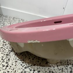 Armitage Shanks inset vanity unit basin in Flamingo Pink. The Orbit model made by Armitage Shanks was popular throughout the 1970s and 80s, installed in both domestic and commercial premises. This Orbit basin is in Flamingo Pink, a bold and vibrant colour made in the late 1970s exclusively made by Armitage Shanks.