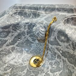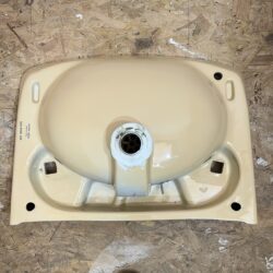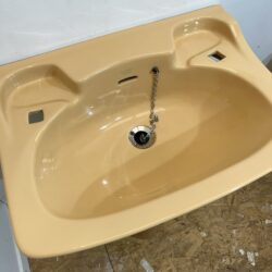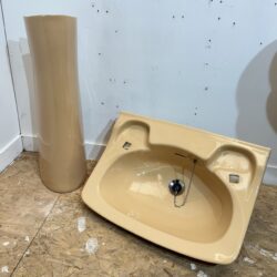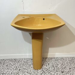 Retro Armitage Shanks ‘Avon’ basin and pedestal in the colour Sun King. This sink is dated from 1971 and in the beautiful Sun King colour. Sun King was similar to peach, except had a more orange, sandy tone to it and was first released in the very late 1960s. The basin is part of the Avon range by Armitage Shanks and has 2 tap holes.