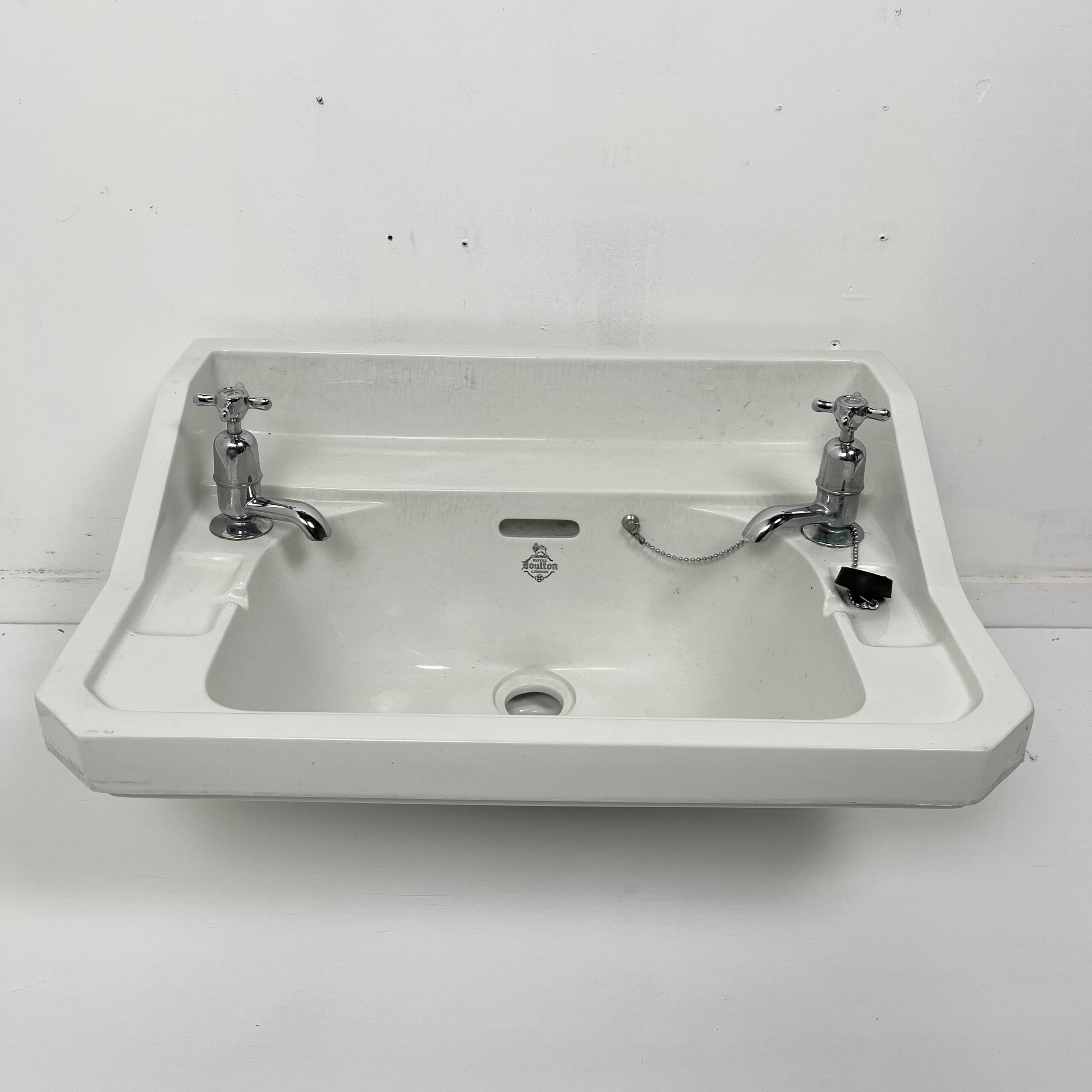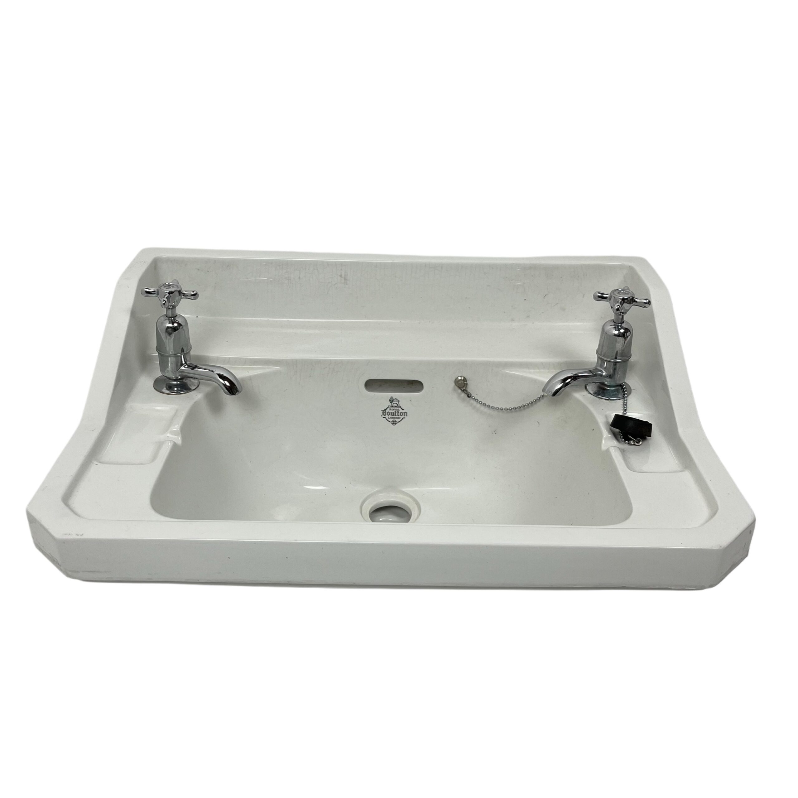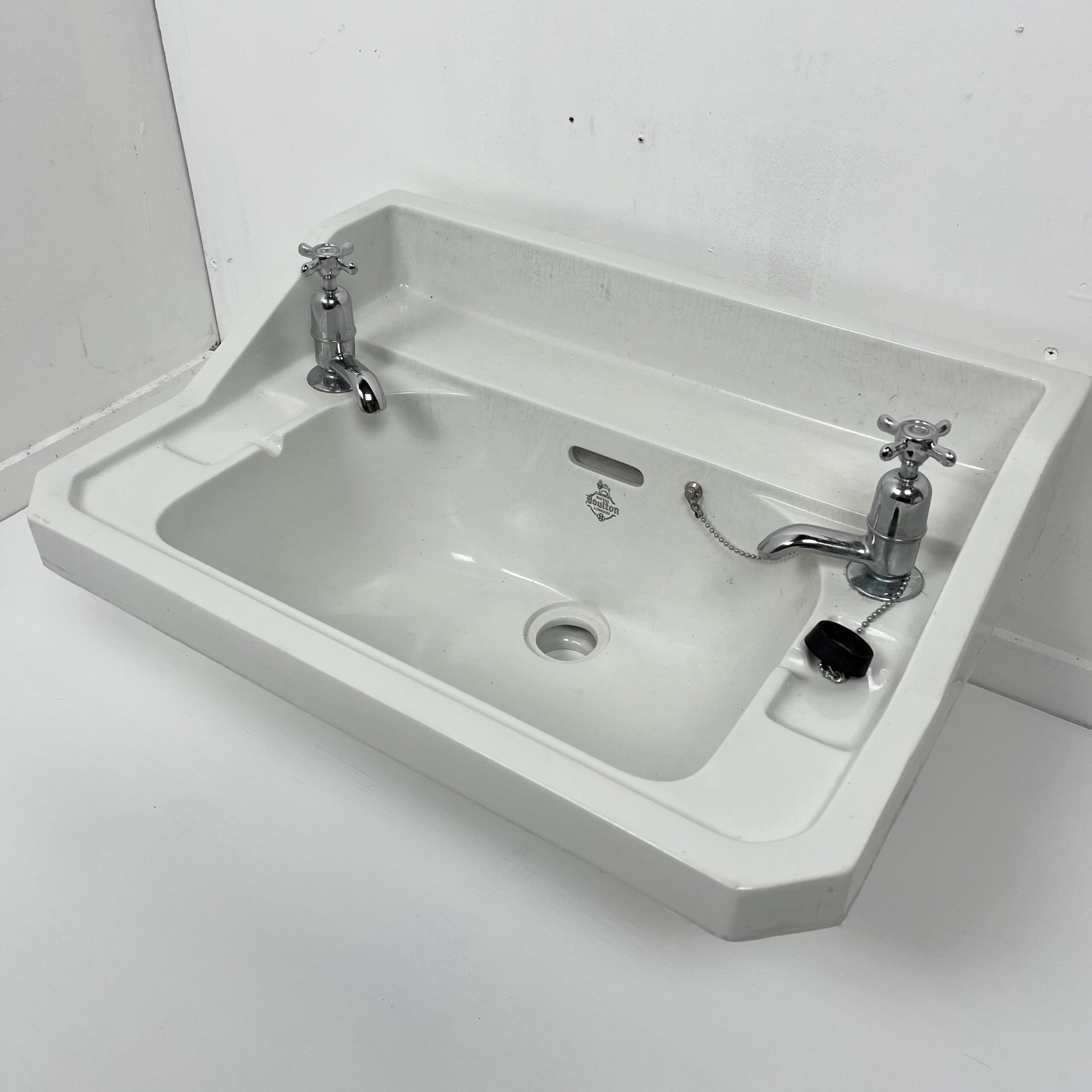 Very nice reclaimed Royal Doulton basin with taps in original condition. This basin is dated from 1935 in an attractive cut corner design which was highly popular during the 1930s.