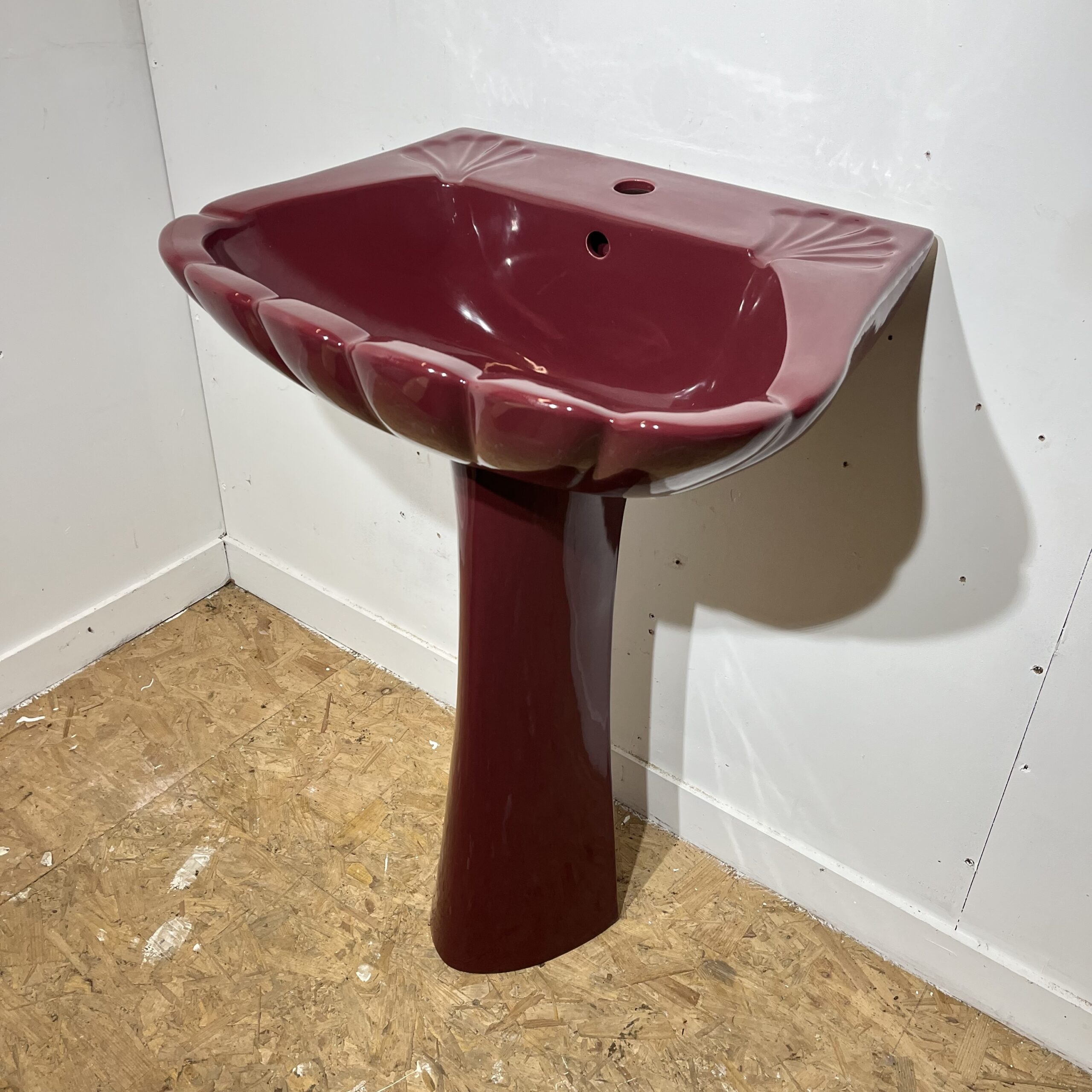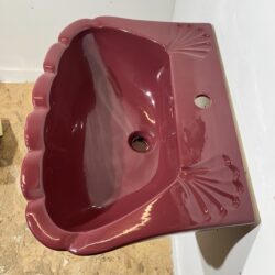 Stunning retro basin and pedestal set made by Qualcast Bathrooms in a scallop / shell shape. The basin has 1 tap hole suitable for a modern mixer tap and has 2 soap recesses on both sides. This sink would be perfect as a vibrant statement piece in a bathroom or downstairs cloakroom.