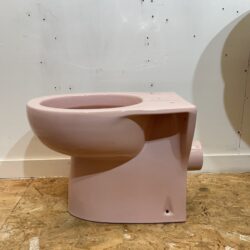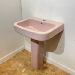 Retro cloakroom toilet and sink set in the colour Chiffon Pink. This candy floss pink cloakroom set consists of a back to wall toilet pan with horizontal outlet and a sleek retro basin with pedestal in the matching colour. Both toilet and sink are made by Shires Bathrooms, with the sink being part of the Opus model, which was selected by The London Design Centre when it was first released in the 1980s.