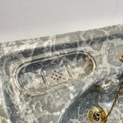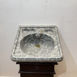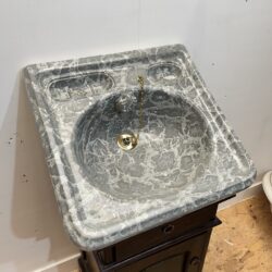 Attractive small basin with a grey sponge marble effect, this basin is dated from 1917 and is in immaculate condition for its age. There are 2 integrated soap holders each with a drain off which goes into the basin. Brass waste and plug also included.