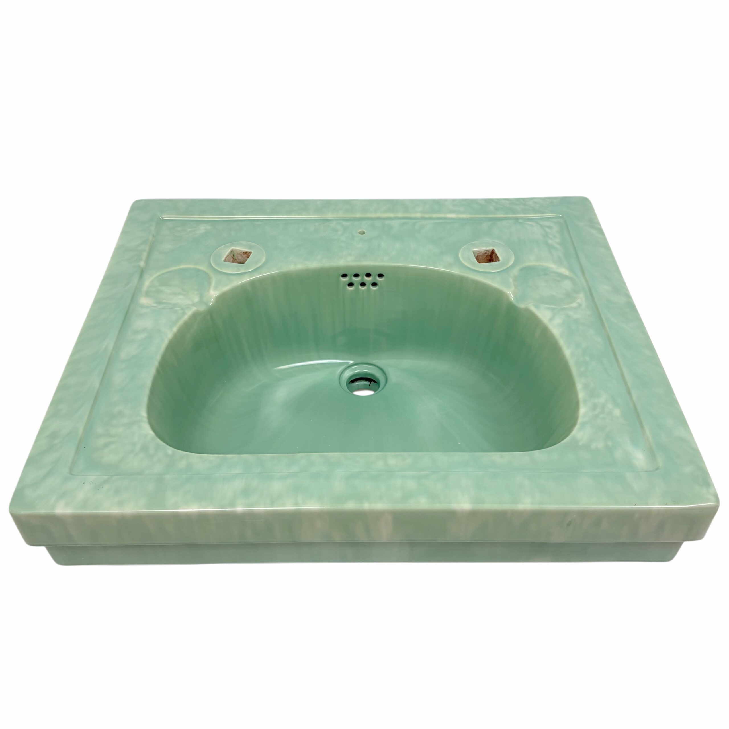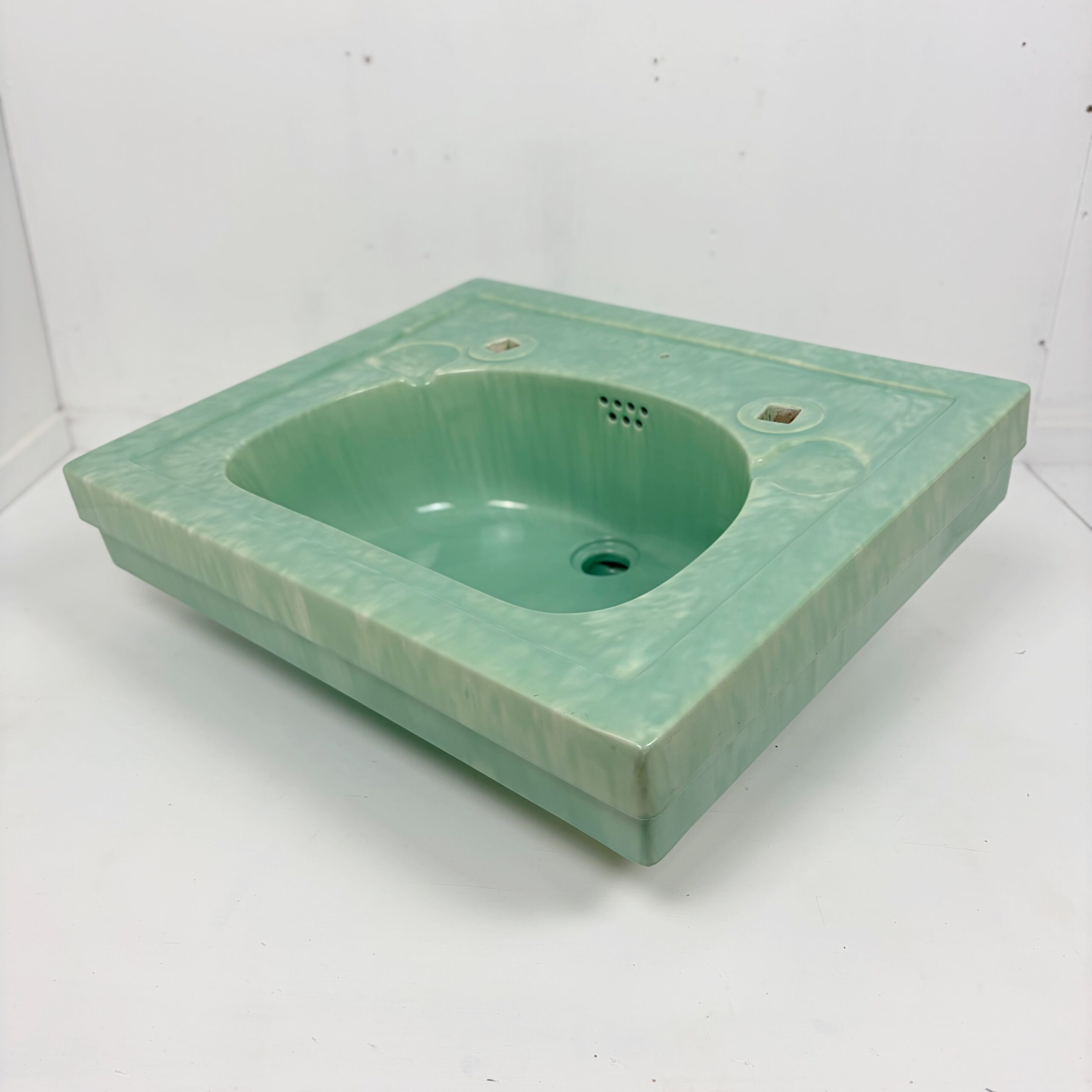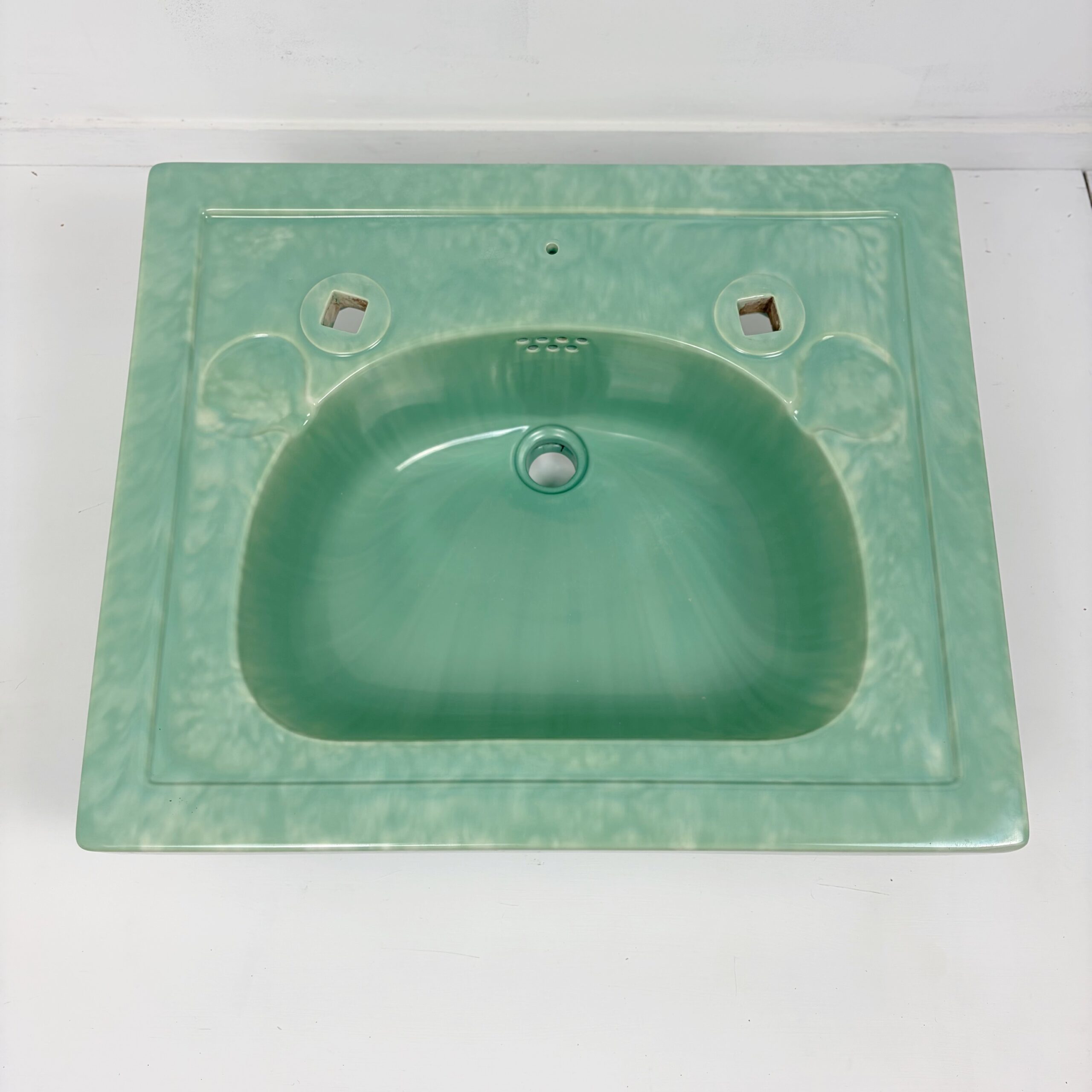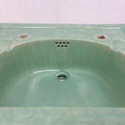 Attractive bathroom basin made by Edward Johns, also known as Armitage Ware in a green marble glaze manufactured sometime in the 1930s at the height of the Art Deco period. This basin has two tap holes suitable for vintage or modern taps and has two small soap holders on either side of the taps. There are two indentations at the bottom of the basin for brackets so the basin can be wall mounted as a pedestal is not supplied.