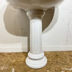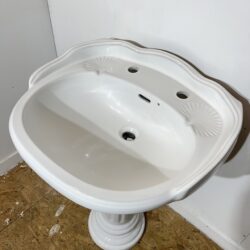 Attractive traditional basin and pedestal made in Brazil by Incepa. This basin and pedestal set is in a traditional colonial style, popular in the 1990s and also made by bathroom manufacturers such as Shires, Heritage and Sanitana. The basin has 2 tap holes suitable for modern taps and 2 soap recesses on either side of the taps.