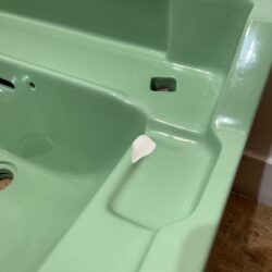 Beautiful Art Deco basin suitable for either pedestal or wall mounting in the attractive vintage colour of Jade Green. This basin is dated from 1949 and is likely made by Howsons as it is akin to many of Howsons designs. Jade Green was also a very popular bathroom colour during the 1940s and 50s and it is still a highly desirable and sought after colour for those wanting to add vintage fixtures to their bathrooms.