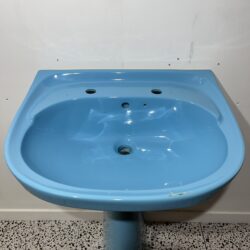 New old stock Armitage Shanks Sandringham basin with pedestal in Pacific Blue. Good overall condition, slight small chip on the back of the pedestal which can’t be seen when installed and 2 very small marks on the basin. Pacific Blue was a very popular colour during the 1980s specifically made by Armitage Shanks, we stock many other items such as WCs in Pacific Blue.