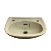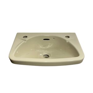 This small retro cloakroom basin is dated from the 1980s and made by Ideal Standard with 2 tap holes suitable for modern taps. It is in the very popular colour of Pampas, which is a greyish green colour similar to Sage Green. This small basin is suitable for downstairs cloakrooms and would be ideal for replacement purposes or if you are looking to add some retro colours to your bathroom or cloakroom.