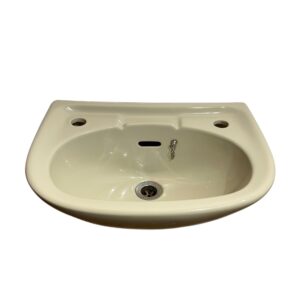 Twyfords Mina cloakroom handwash basin in the distinctive colour of Pampas, which is a light sage green colour popular in the late 1960s, 70s and 80s. This basin would be ideal in a small downstairs toilet and is ideal for replacement purposes or if you are looking to add some retro colours to your cloakroom. If you are looking to replace a Pampas basin, this basin will go with bathroom fixtures also in the colour Pampas made by different companies such as Royal Doulton, Shires, Johnson Brothers, Armitage Shanks, Ideal Standard or Allia.