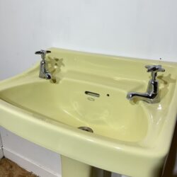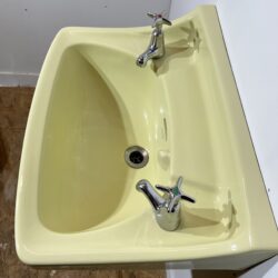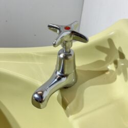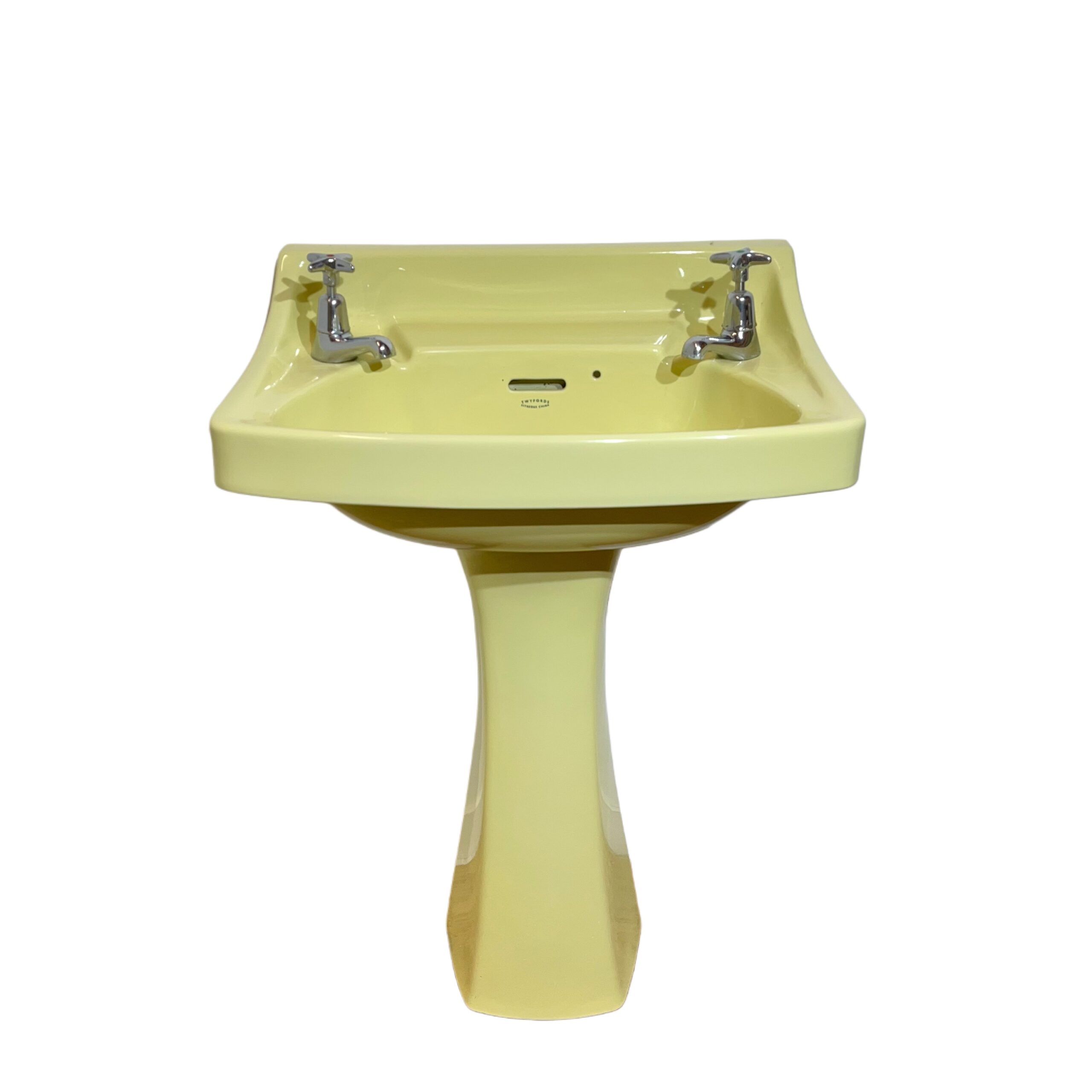 Attractive basin and pedestal set made by Twyfords in the early 1960s. This sink is in the stunning colour of Primrose Yellow, an iconic bathroom colour made in the 1950s, 60s and 70s, with it being at its most popular in the 1960s. This item is a genuine mid century modern piece complete with original pedestal and retro chrome taps.