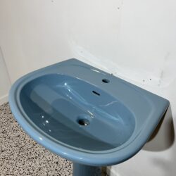 Retro Bermuda Blue basin and pedestal made by Warneton Ceramics. Belgian made and imported this Warneton made sink is new old stock so has never been used and is in very good overall condition, however there are some chips to the pedestal as seen in photos, once installed these would be very difficult to notice.