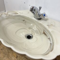 Beautiful retro 1970s cloakroom basin in a shell / scallop shape with a distinctive cream and brown marble glaze effect. This basin is made by Ideal Standard and is the Marmara model, a luxury handwash basin made in the 1970s and 1980s. There is one tap hole suitable for a modern mixer tap, original mixer tap shown in photo can be included in the price but is sold as seen without restoration work done to it.