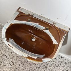 Shires Allegro retro mid century basin and pedestal in Harmony Brown. Harmony Brown was an exclusive colour made by Shires Bathrooms in the 1970s and was part of their 2 toned colour range. This basin and pedestal is new old stock so has never been used and is in immaculate overall condition with no chips or cracks. This sink could be suitable as a replacement or if you are looking to add some colour into your bathroom and use this 2 toned brown coloured basin as a feature.