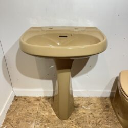 Attractive retro toilet and pedestal washbasin set made by Twyfords Bathrooms in the colour Sandalwood. This suite comprises of a back to wall toilet pan with original heavy duty plastic toilet seat and pedestal washbasin with 2 tap holes. The toilet pan is P trap and is the Celtic model by Twyfords and still retains the original toilet seat, which is in a fair condition for its age. The basin and pedestal are part of the Nocturne range by Twyfords, with 2 tap holes and 2 soap indentations with drain off. The basin and pedestal has some signs of wear but has been fully cleaned to a like new condition.