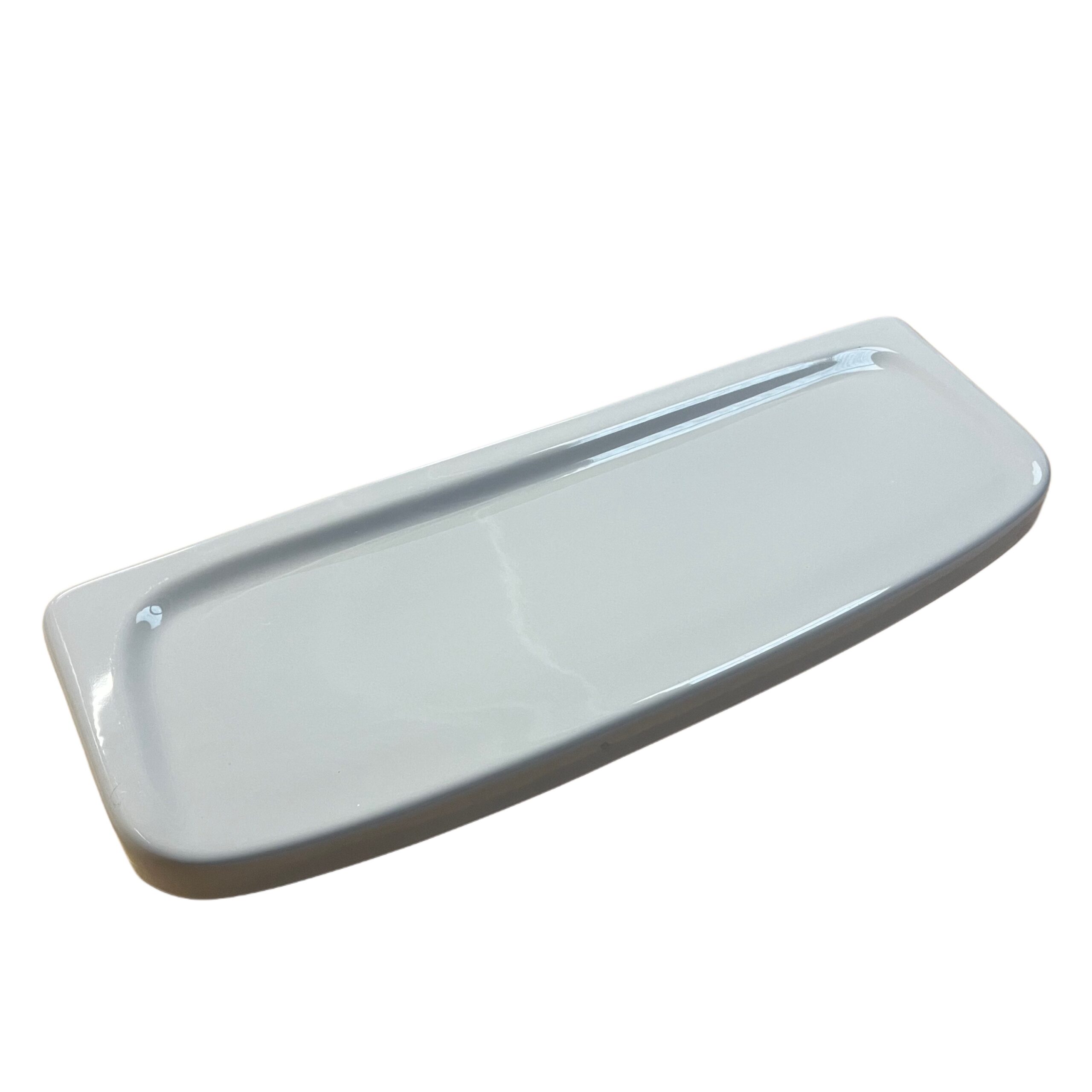 Shires Denbigh low level toilet cistern lid in the colour Misty Grey. The Denbigh cistern was a popular model made by Shires and was manufactured in the 1980s and 1990s, this particular cistern lid is likely to be from the late 80s or early 90s when the colour Misty Grey, also known as Whisper Grey, was produced.