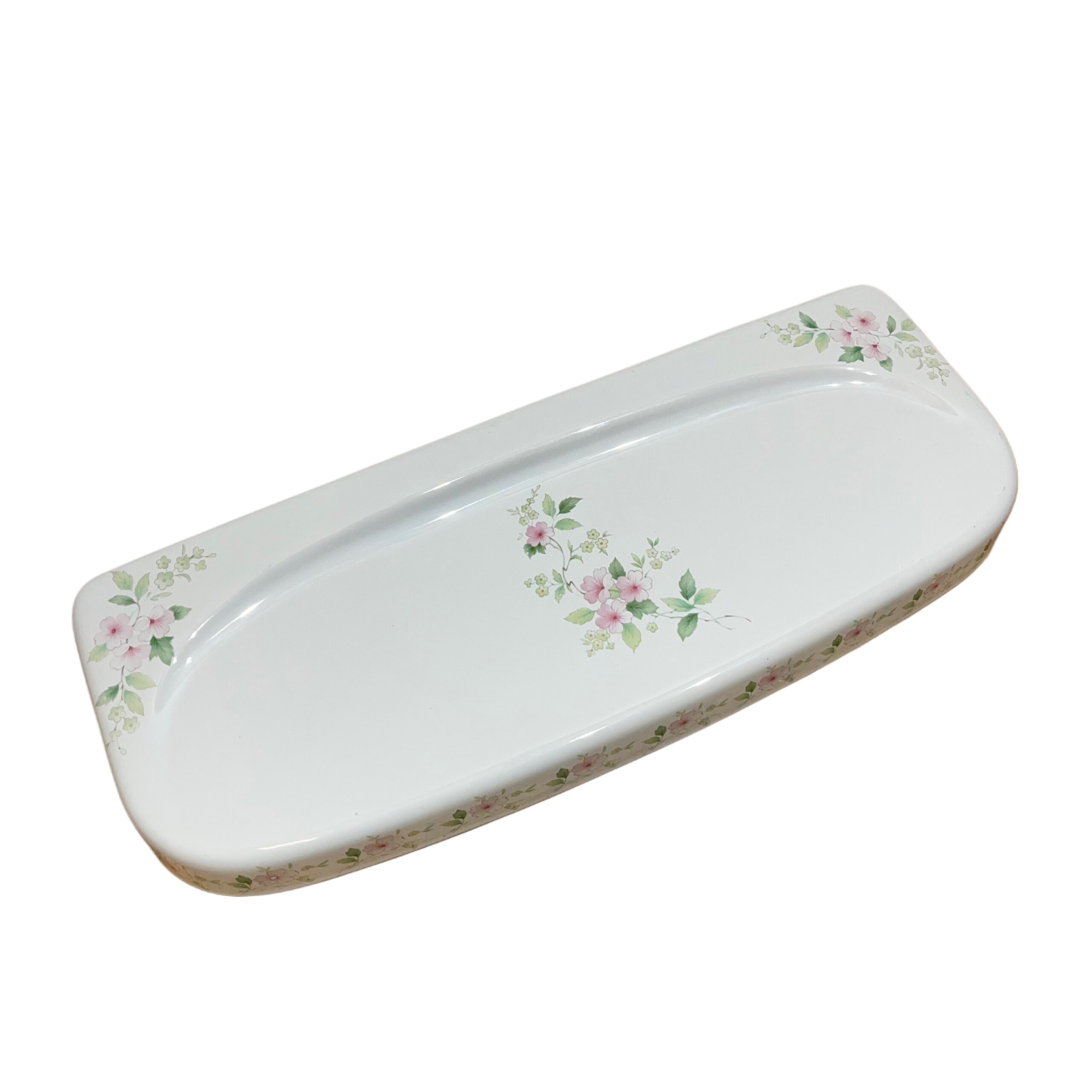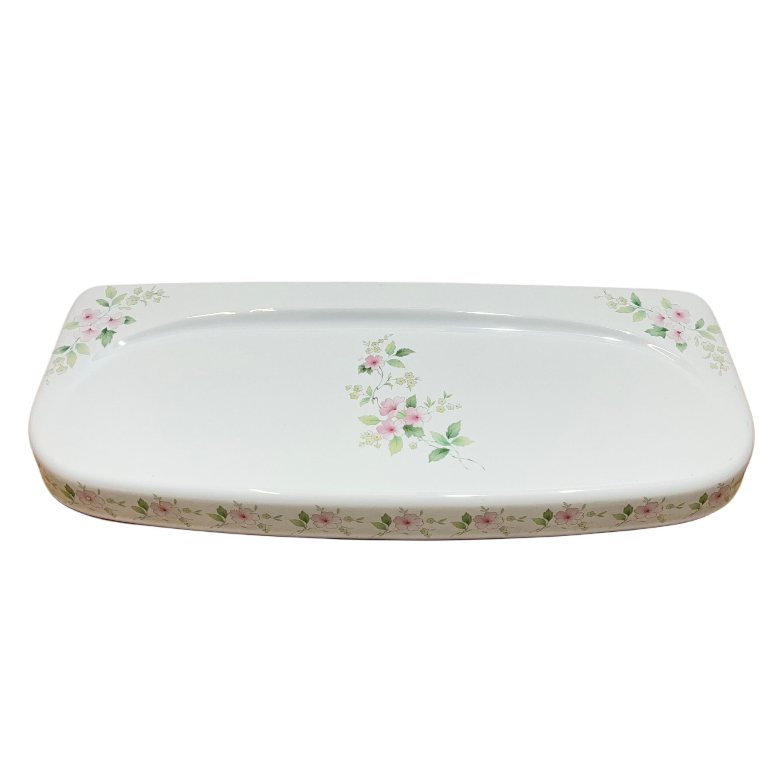 Shires cistern lid in white with pink floral transfers. This cistern lid is for close coupled Shires WCs and suitable for the Prelude, Carousel and Serenade models, which were all popular models by Shires in the 1990s. The lid is in very good overall condition with no chips or cracks and is suitable for replacement purposes.