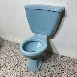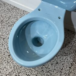 Ideal Standard / “Standard” close coupled toilet pan and cistern in Sky Blue. This toilet is part of the Lincoln range, a compact and space saving toilet designed and made in the 1960s and which came in either the washdown variant or double trap syphonic, with this one being the syphonic version. Double trap syphonic toilets are no longer produced but were a very innovative design, having a vacuum system fitted or built into the ceramic to create a quiet and efficient flush. Would make a good installation if you are restoring a mid century home and want original coloured sanitaryware or if you are looking to replace a broken Ideal Standard close coupled toilet in Sky Blue. Basin and pedestals also available for sale in Sky Blue.
