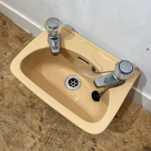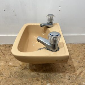 This retro cloakroom basin made by Shires is dated from the 1970s and is in the colour Sun King. This basin is very compact and small, perfect for a downstairs cloakroom or small bathroom. Sun King was also a very popular bathroom colour in the 1970s, it is a beigey orange colour similar to Peach. Would be ideal for replacement purposes or if you are looking to recreate a retro cloakroom.