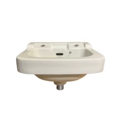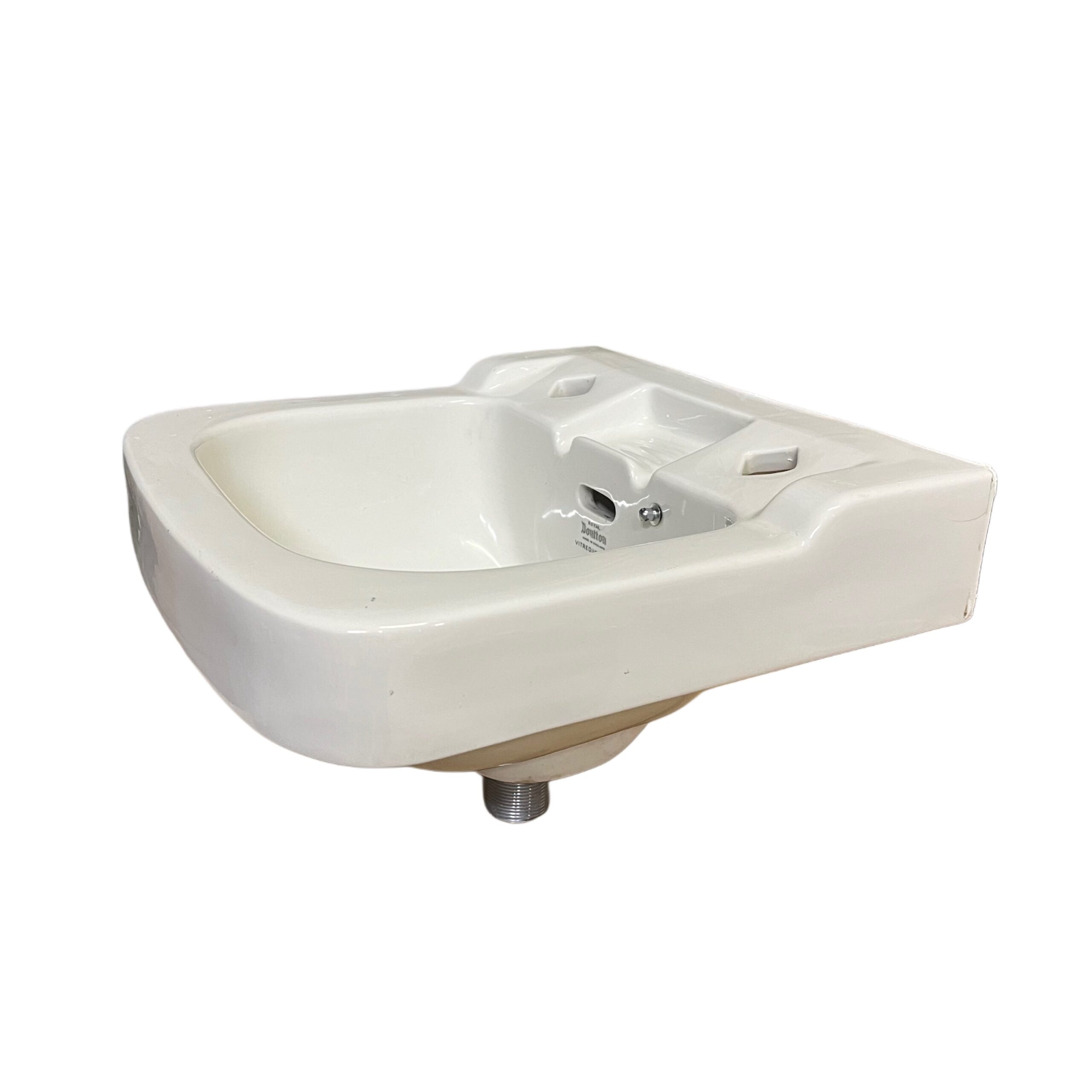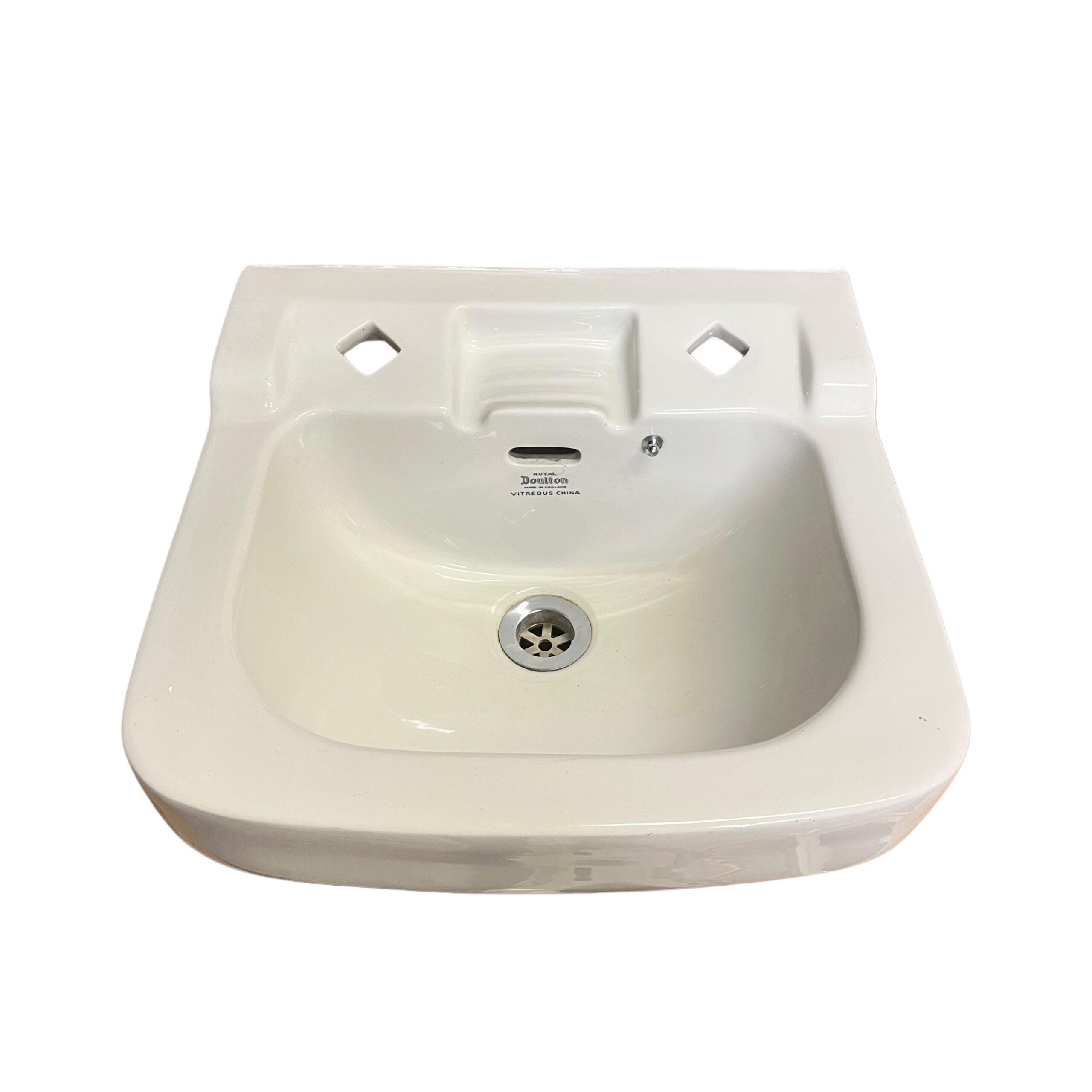 Charming small cloakroom basin made by Royal Doulton dating from the 1950s. This reclaimed period washbasin would suit a small cloakroom or en-suite in an old home or restaurant, it has 2 tap holes suitable for modern or vintage taps and a small soap recess between the two tap holes.