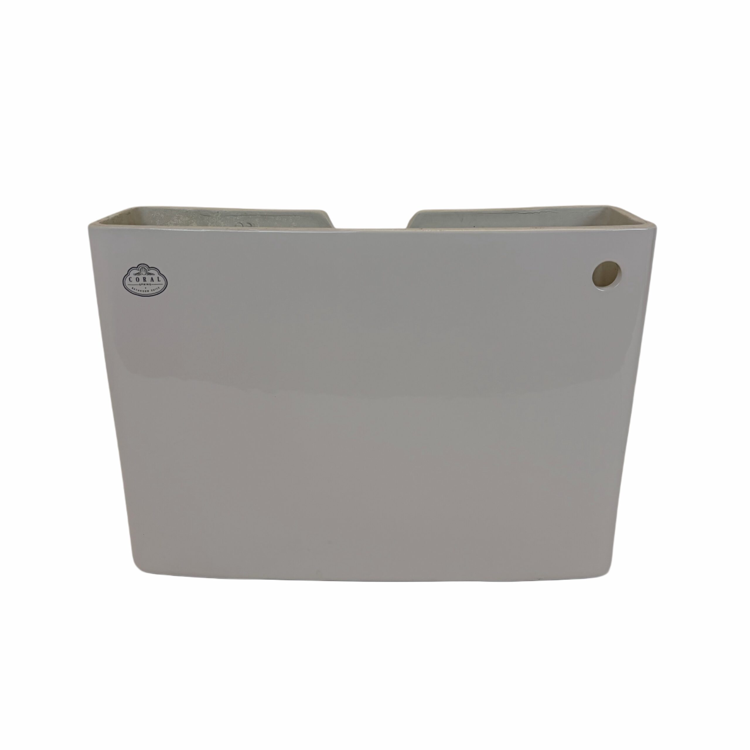 Close coupled toilet cistern made by Spring Bathrooms and part of the Coral model in the colour Misty Peach. The Springs Coral was a popular bathroom model in the 1990s and features a scallop shaped cistern lid. Priced here is the cistern body itself not the lid. This cistern is also in the now discontinued bathroom colour of Misty Peach, a very light shade of peach which almost looks white but with a slight pink hue.