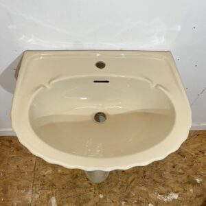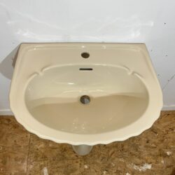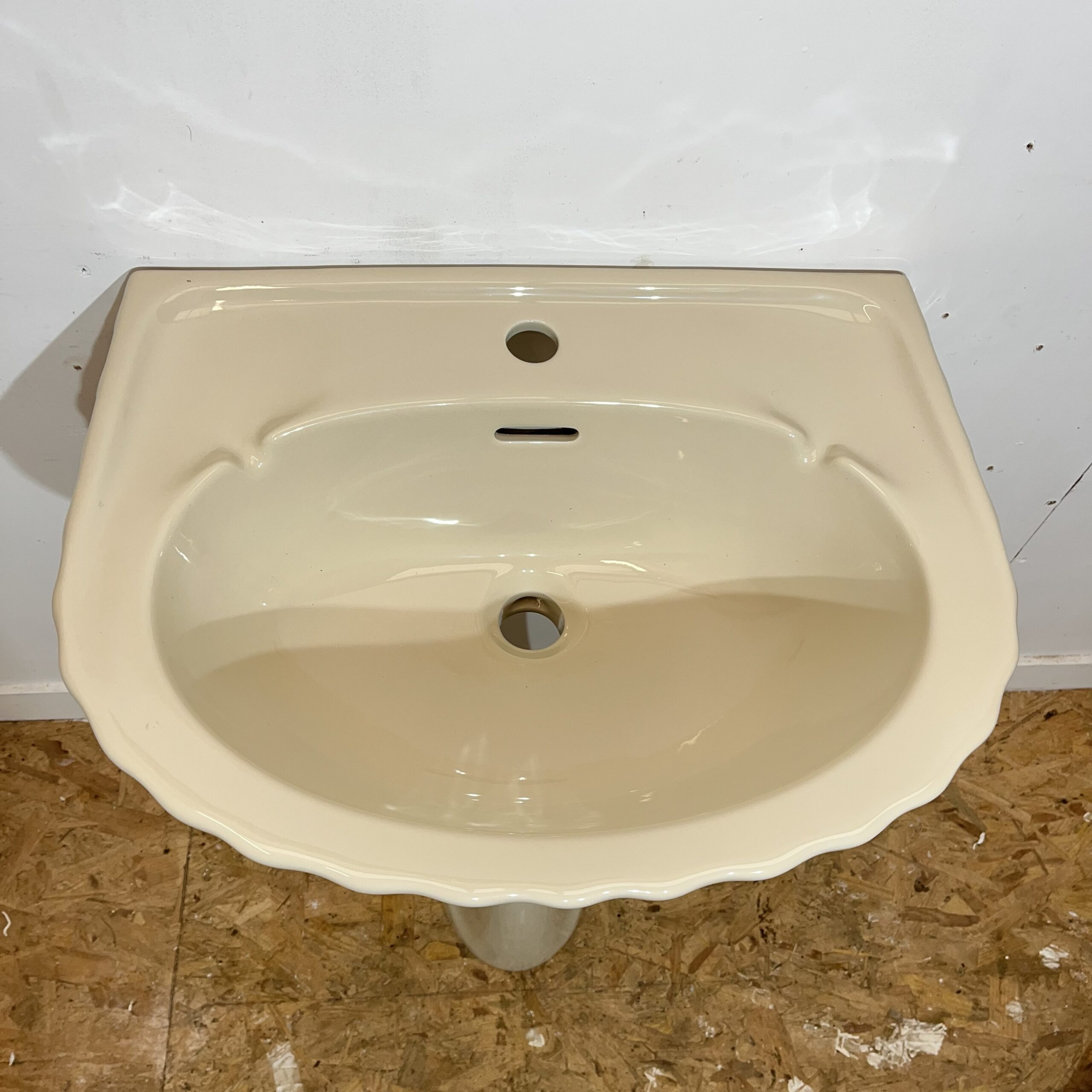 Champagne basin and pedestal made by Trent Bathrooms, otherwise known as Johnson Brothers. This basin and pedestal are dated from the late 1980s to early 1990s, the basin is in a scallop shape with 1 tap hole suitable for a modern mixer tap. Both basin and pedestal are matching and in the colour of Champagne, which was one of the most popular bathroom colours of the 1990s. Both items are new old stock so have never been used and are in immaculate overall condition.
