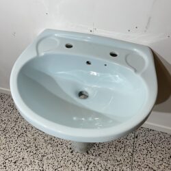 Twyfords / Caradon Vista washbasin and pedestal sink in Freshwater Blue. Made in the 1990s, this item is new old stock so is in excellent condition with no chips or cracks. Freshwater was a popular colour made by Twyfords Bathrooms. During the 1990s bathroom manufacturers such as Twyfords turned to lighter, spring like colours such as Freshwater as a contrast to the popular colours of the 80s such as Burgundy or Avocado.