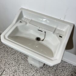 “Standard” reclaimed vintage washbasin and pedestal with 2 tap holes. This basin made by “Standard”, later known as Ideal Standard is made from durable Vitreous China and is in excellent condition with no chips or cracks.