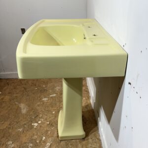 Reclaimed Twyfords basin and pedestal dated from 1958 in Primrose Yellow. This charming vintage sink was reclaimed from the Twyfords Collection, a small museum inside Twyfords former headquarters. This is a large statement piece sink which has plenty of space for toiletries and is in immaculate condition for its age. There are no cracks or crazing to the glaze, there are however a small number of very slight chips on the left hand side of the basin which are photographed.