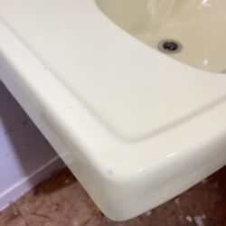 Reclaimed Twyfords basin and pedestal dated from 1958 in Primrose Yellow. This charming vintage sink was reclaimed from the Twyfords Collection, a small museum inside Twyfords former headquarters. This is a large statement piece sink which has plenty of space for toiletries and is in immaculate condition for its age. There are no cracks or crazing to the glaze, there are however a small number of very slight chips on the left hand side of the basin which are photographed.