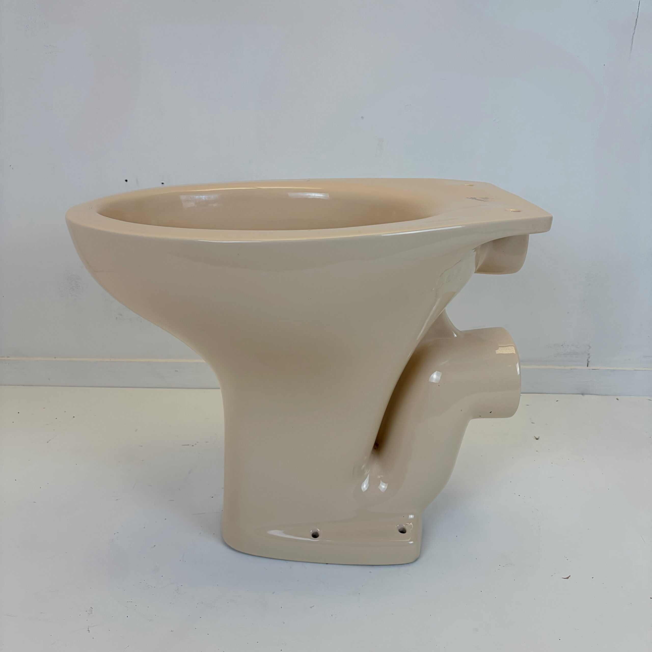 Retro low level toilet pan made by Ideal Standard in the discontinued bathroom colour Whisper Apricot. This toilet pan can be used with low level, high level or even concealed cisterns as part of a new installation. The colour Whisper Apricot was exclusive to Ideal Standard and part of their Whisper colour range. Whisper Apricot is a pale amber colour similar to cream but more yellow.