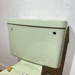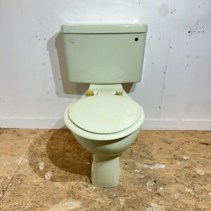 Retro close coupled toilet pan and cistern made by Ideal Standard in the beautiful pastel green shade of Whisper Green. Whisper Green was an exclusive colour made by Ideal Standard in the 1980s, it is a light spring like colour which would brighten up any bathroom or cloakroom. This particular toilet is part of the Tiara range and is reclaimed but has been fully restored to a like new condition. It still retains its original toilet seat which is slightly faded and does have some age related marks.